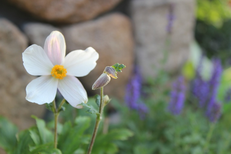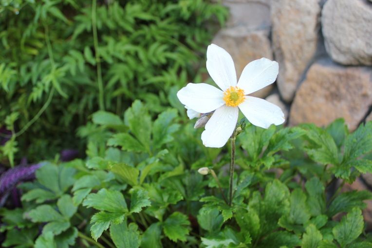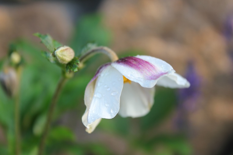 スッと伸ばした花径の先がいくつか分かれて、それぞれの先にシュウメイギクに似た、形の良い白いお花を咲かせてくれます。お花の裏側が薄い青紫色の、とても風情のある上品なお花です。スコットランドのナーセリーから作出された品種で、シュウメイギクとルピコラの交配種と言われています。