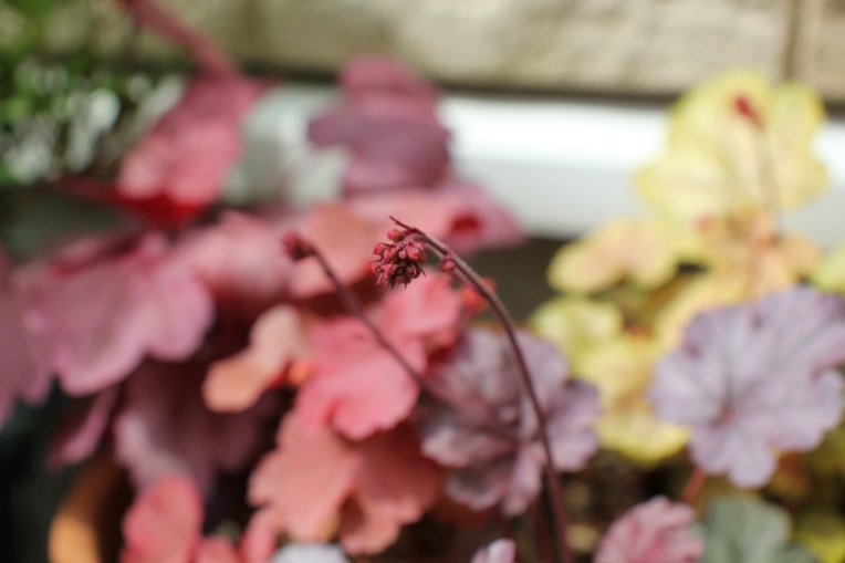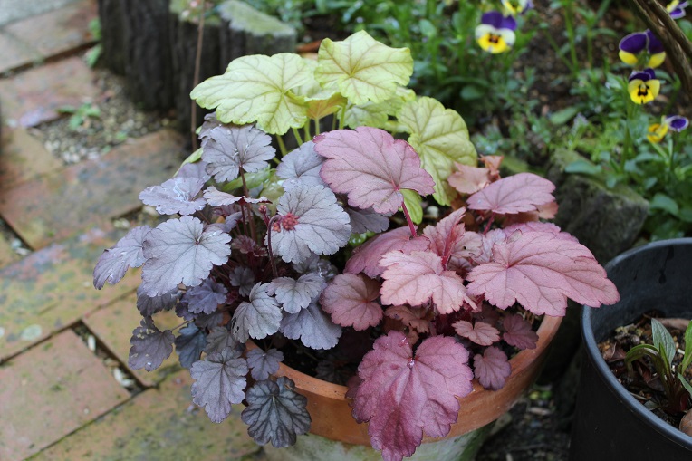 ヒューケラは、とても素敵な葉を一年中楽しむ事が出来ます。私はいくつかの品種を、同じ鉢に組み合わせて寄せ植えにして楽しんでいます。細い茎をひょろりと伸ばして、奥ゆかしいお花を咲かせてくれる姿も、とても可愛らしいです。日当たりの良くない場所でも元気に育ちますので、ありがたい存在です。ぜひお気に入りの葉色のものを見つけて育ててみて下さいね!おすすめです。