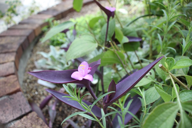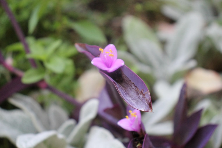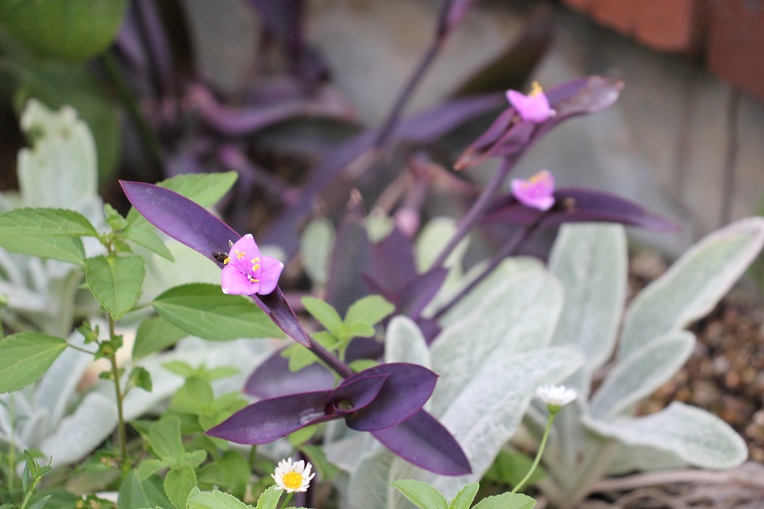 紫色の葉が美しい、カラーリーフプランツです。少し厚みのある葉は細長く、全体が毛で覆われていますので、雨水をはじきます。葉の付け根が、茎を包むように付いていますので、エンドウ豆のさやのような形です。葉に淡い赤紫色の縞模様が入る品種もあります。原産地はメキシコで、別名は「パープルハート」です。